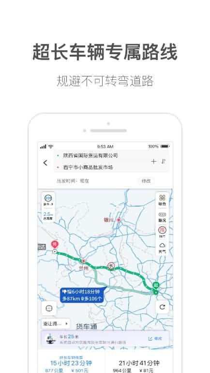货车通导航依据预设的起点及终点,获取ADAS地图蹊径属性,并团结蹊径曲率,航向,坡度,蹊径宽度等因素,来提高车辆通过性的盘算精度。同时货车通将所限制路段信息团结车辆自身参数,举行路径的盘算,从而形成超长货运车辆的奇异盘算路径。在妄想阶段,提前举行数据预估,给出用户所需注重或避开的障碍点。