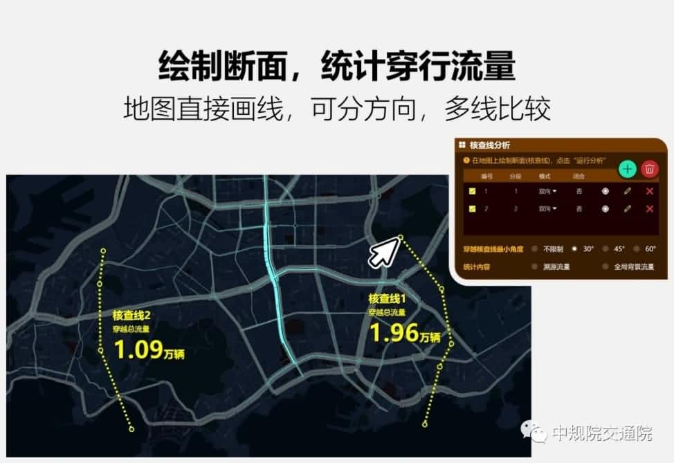 2.3 断面流量统计,有几多车穿城而过?核查线工具用于统计穿越自界说断面的车流量。直接在地图上自由绘制断面,支持直线段、多段线、闭合区域;支持正向、反向、双向流量统计;支持多个核查线同时剖析较量;团结筛选剖析器可实现长距离、分车型等高级核查线剖析。