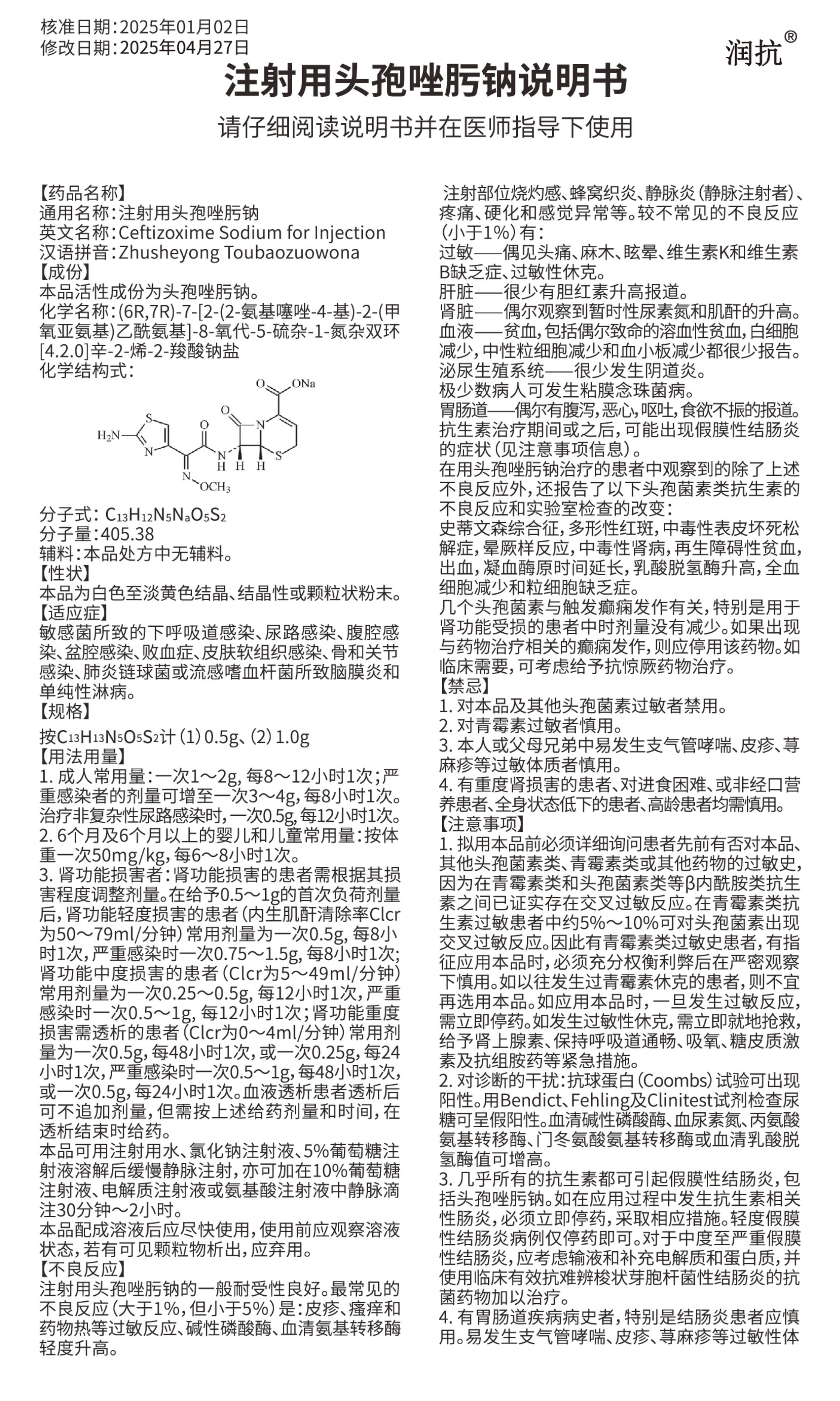 注射用头孢唑肟钠说明书_01